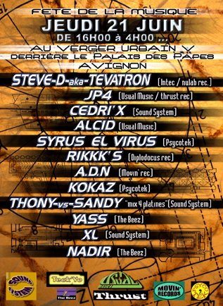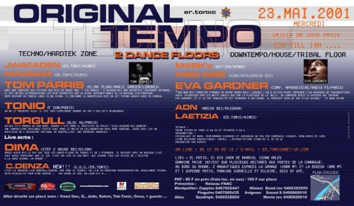 Fri 11 May -Girona (CAT)(SP)- Dj: Mistrees Barbara. /??ptas. (Sala del Cel, c/Pedret,118) Fri 11 May -Marseille (13)- "GENERATION BIP HOP 6" Live acts: Phonem, OpaH b. Video pojections. /30FF (20:30 La Machine a Coudre, 6 rue Jean Roque 13001) Fri 11 May -Marseille (13)- "MASSILIA NOVA" with: Loop, Mars XP, Zol, Mark, Yvi Slan, Projet Mystere. /60FF (21:00 Poste a Galene, rue Ferrari) 11-12 May -Marseille (13)- "FESTIVAL REGGAE RAGGA SKA" with: No more Babylon, Jagdish, Sons of Gaia, Cameleons, Djaman & Black dick, Malik Fahim & Royaltix, 38 dub Band, Natural, Militan Band, Cry freedom, Watcha, les Rats's cassent. /70F et 90F (Mas des Pins, RN113 entre la Fare les Oliviers et Vitrolles 18:30) Sat 12 May -Avignon (84)- "TECH-DIMENSIONS" Dj's: Kevin, James, Sims, Chris de Bond, Adn, Peers, Fab, J'Ulles, Drix. /50FF (RDV A9 Sortie Avignon Sud) Sat 12 May -Fraga (HUESCA)(SP)- Dj's: Carl Cox & Angel Molina. /3000ptas (Florida 135) Sat 12 May -Montpellier (34)- "FRESHLY CUT" Dj's: FUTURE CUT, INTERLOPE live, MC MIAMIX, DJ KEY a.k.a ALCID. Visuals by Gahan Asonjestal & M'n'Ms. /??FF (Rockstore, rue de Verdun 21:00)![]() Sat 12 May -Fontaine (38)- "IMPACT" voir fly. /80FF (La Ferme de l'Abbaye)![]() Sat 12 May -Beauvoisin (30)- "OSMOSE"Tek House dj's: Seb Ol (Hype Diversion), Oxxo (Nowhere), Jwafaden (er.tomic), Luk Noise (shak's), XL (Sound System), Bastien (WOH). 6kW sound. /30FF (Pitchou Club, 13 place du Temple, De Nimes sur le periph, prendre dir Generac, puis Beauvoisin et suivre les fleches) Sat 12 may -Marseille (13)- "THRUST PART II" with: Tina Lestate, Virtualian, Olive, JP4, Pat. /40FF (Cafe Julien, cours Julien) Sun 13 May -Villeurbanne (69)- "ALTERNATIVE" Wolf Tek Dj's: Med (WT), HK (WT), Diesel (alternative), Cess (neutralkorp). Live act: Stef (WT), Mempamal. /30FF (22:00-05:00 Pezner, Cours Tolstoi - 3672 *1 code 424342)![]() Wed 16 May -Paris (75)- "ELECTRO LAB FACTORY" Djs: SMB (insomniak), Kraft (Gazoll), Live acts: IxInDaMix, Les Boucles Etranges. /50FF (L'Enfer 34 rue du depart 75014)![]() Fri 18 May -Montpellier (34)- "NOCTURNAL DISTURBANCE" Live Acts: 69DB, UBIQ... /??FF (22:00-06:00 Zenith, domaine de Grammont)![]() Fri 18 May -London (UK)- "SICK AND TWISTED" gabba, digital hardcore, drill and bass, hardcore industrial, techno, dark d'n'b, eeevil noize... Dj's: ALEX B, BROKEN YOLK. Live act: TRAFFIK, MATT GREEN. /£5 (10:00-03:00 UPSTAIRS @ THE GARAGE, 20-22 Highbury Corner, Islington) Fri 18 May -Marseille (13)- "MISSION TO MARS" Drum'n Bass Dj's: Kemal, Le Lutin, Willyman, Kafra, Koko. /??FF (Cabaret Rouge, Docks des Suds, rue Urbain VI) Sat 19 May -Angers (86)- "GAY PRIDE" hétéros homos tous ensemble contre la discrimination dans la parentalité, le droit de séjour, le travail et le couple. Sat 19 May -Rouen (76)- "GAY PRIDE" hétéros homos tous ensemble contre la discrimination dans la parentalité, le droit de séjour, le travail et le couple. Sat 19 May -Draguignan (83)- 18:00 Conférence: la Techeuno par Tournesol, professeur. 20:00 Live act: Oko System. 21:00 Mix by Sonar et après AFTER FLK. /0FF (18:00-22:00 Biblioth`que)![]() Sat 19 May -Mexico (MX)- "ORIENTAL CHAOS 2001" Dj's: Double Dragon Japon, John Phord London, Robert Mexico. Live act: Soma Sound System London, Ecliptic Mexico.. Todos los servicios, zona de acampar, camiones de Playa de Carmen, Cancun, Merida... /30$ (Un km antes de las ruinas de Tulum entre las ruinas y Xel-Ha Preventa:High Risk México (01) 53 70 74 01, Diesel Playa del Carmen, +Info here)![]() Thue 23 May -Arles (13)- "ORIGINAL TEMPO" 2 plateaux. Dj's: Jwafaden (er.tomic/Nīmes), Madison (er.tomic/Nīmes), Tom Parris (Plink Plonk/Magic Garden/Londres), Tonio (F Com/Paris), Torgull (Bloc 46/Paris), M@rk's (Oxy'Zen/Nīmes), Miss Airie (Xing/Diplodocus rec), Eva Gardner (Comp. Aphrodisiac/Radio FG/Paris) Mix Aphrodisiac, ADN (Movin rec/Avignon), Laėtizia (er.tomic/Nimes)Technik. Live acts : Dima (Choice rec/Dijon), C.Denza (S.O.S./er.tomic) . Psycholight by Bern, performance echasses et cracheurs de feu par compagnie Viagrax, show dance by Lara. Holistic system : massage shia tsu, esoteric card et chamanic design, Deco aerienne . /100FF (El Patio, 51 bis chem de Barriol + AFTER)![]() Sat 26 May -Annecy (74)- avec: Radium, Laurent Ho, Jeff, Sabatek, Maniaks. /??FF (3672* 1 code 260588 ou 999555) Thur 31 May -Aix en Provence (13)- "OKOSYSTEM" de l'ElectroJazz à la tekno Hardcore...Live act: Oko System team. /0FF (Conservatoire de Musique) Sat 2 Jun -Montpellier (34)- "GAY PRIDE" hétéros homos tous ensemble contre la discrimination dans la parentalité, le droit de séjour, le travail et le couple. Sat 2 Jun -Grenoble (38)- "EXPRESSIONS OF RAGE" Dj's: DRISS, DAMIEN, STEPH, CHAI, GOBLIN, ISRAEL. /80FF (3672 *1 code 062001#) Sat 9 Jun -Nantes (44)- "GAY PRIDE" hétéros homos tous ensemble contre la discrimination dans la parentalité, le droit de séjour, le travail et le couple. Sat 9 Jun -Reims (51)- "GAY PRIDE" hétéros homos tous ensemble contre la discrimination dans la parentalité, le droit de séjour, le travail et le couple. Sat 16 Jun -Bordeaux (33)- "GAY PRIDE" hétéros homos tous ensemble contre la discrimination dans la parentalité, le droit de séjour, le travail et le couple. Sat 16 Jun -Lyon (69)- "GAY PRIDE" hétéros homos tous ensemble contre la discrimination dans la parentalité, le droit de séjour, le travail et le couple. Sat 16 Jun -Rennes (35)- "GAY PRIDE" hétéros homos tous ensemble contre la discrimination dans la parentalité, le droit de séjour, le travail et le couple. Sat 16 Jun -Lille (59)- "GAY PRIDE" hétéros homos tous ensemble contre la discrimination dans la parentalité, le droit de séjour, le travail et le couple.![]() Thur 21 Jun -Avignon (84)- "FETE DE LA MUSIQUE" ./0FF (Verger Urbain V, derriere Palais des Papes) Sat 30 Jun -Marseille (13)- "GAY PRIDE" hétéros homos tous ensemble contre la discrimination dans la parentalité, le droit de séjour, le travail et le couple. Sat 23 Jun -