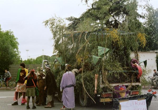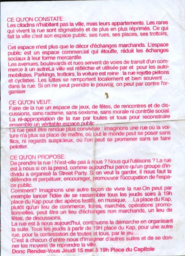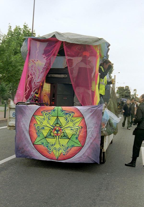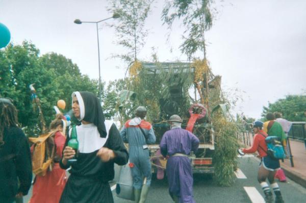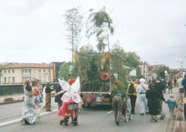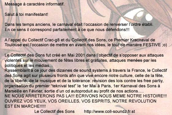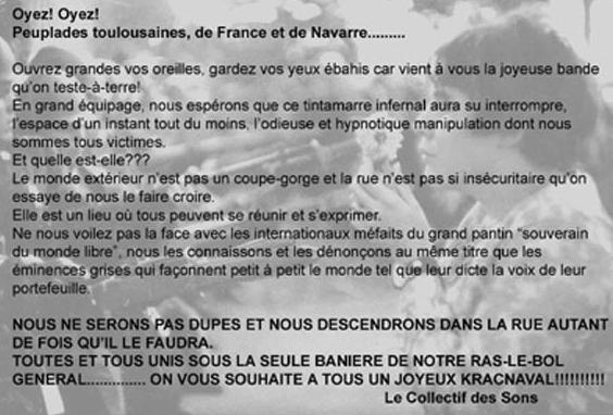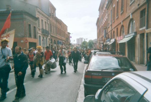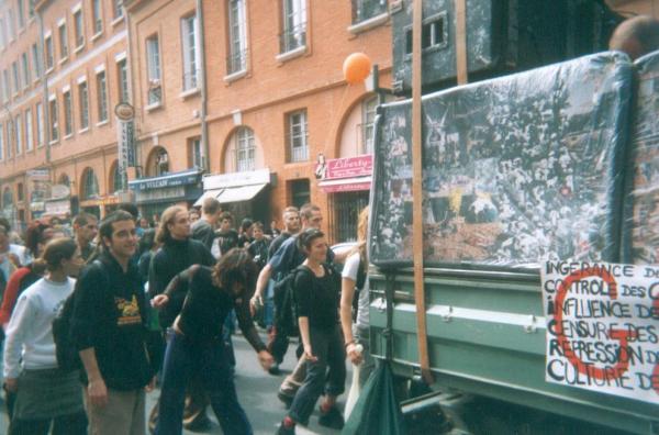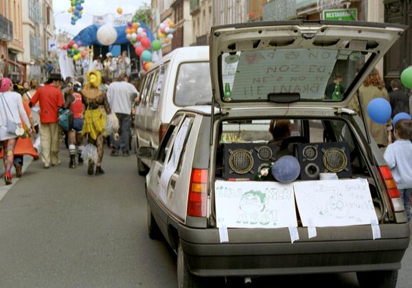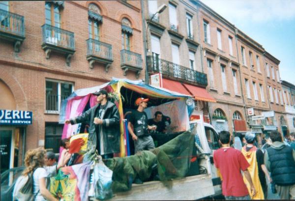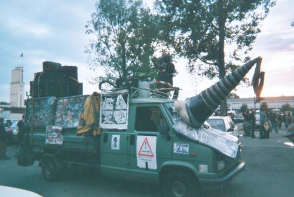 Excellente journée à Toulouse ! 12 chars la plupart de sound systems, des objets roulants non identifiés, des visages très sympathiques et bien déguisés, un accueil favorable des passants, un passage au centre ville des plus réussis avec une longue halte, des autorités pas emmerdantes pour un sou, et une manif bien préparée avec un temps excellent juste pour défiler, des lives variés (hardcore, jungle, house, tekno, punk, rock, rap)... que demander d'autres ? Peut-être un parcours encore plus central ? peut-être une pub plus importante... Sûr que le karnaval des sons de Toulouse l'an prochain ca va être mortel ! Inz |