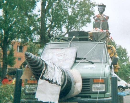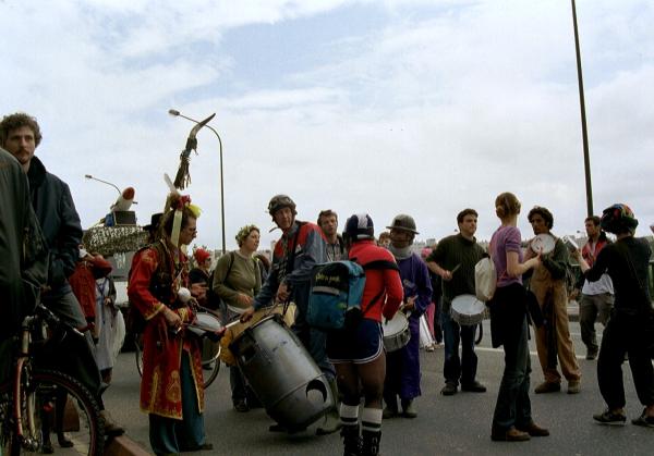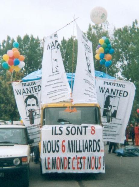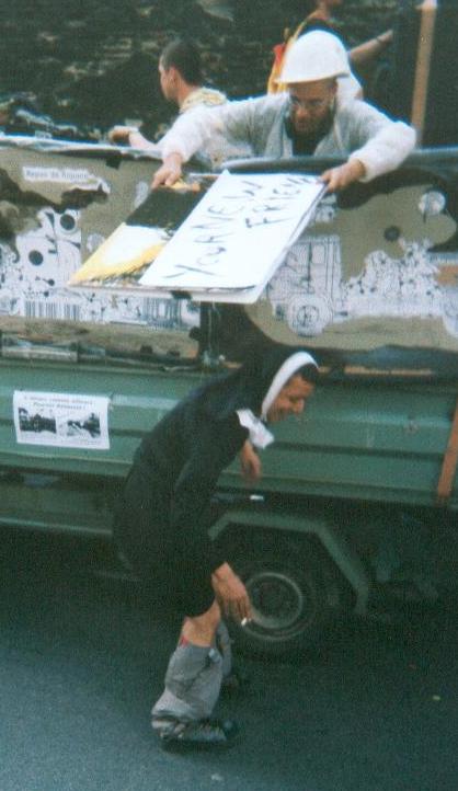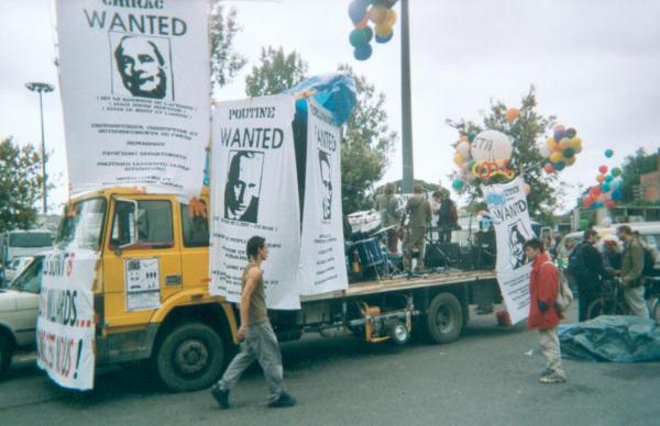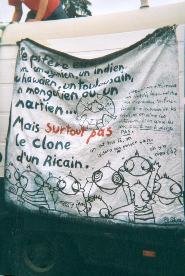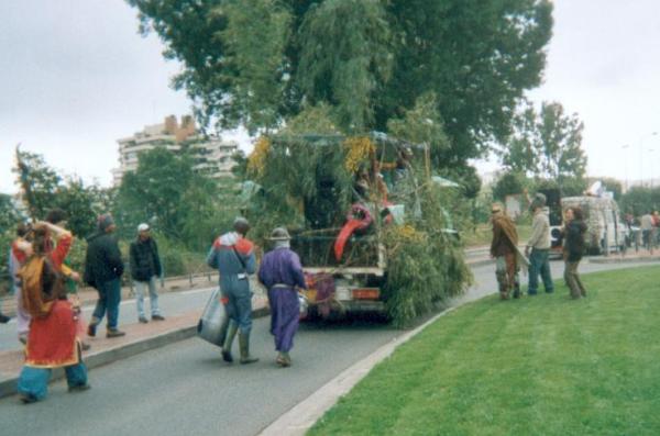 Un bon petit cracnaval :o) une réussite on peut dire ! J'ai dénombré une douzaine de char dont le char du cracg8 avec des groupes ska rock et puis après principalement des sound systems. Une batuc' qui n'a pas chomé ! Au niveau de la musique, je trouve qu'il y avait une bonne diversité de sons : de la bonne jungle sur le char de la firme, du bon HK sur le poids lourd des voodooz, du bon ragga et un pur live par tournesol et Z sur notre char (konglo/ oko/ drôle de jungle), du bon hip hop et des toasters sur plusieurs chars, et j'en oublie ! Concernant l'affluence je dirai 2000 ? au plus fort de la journée, ce qui est tt à fait honorable. Mention spéciale pour les déguisements ! franchement ya eu du bon lachage :o) je trouve qu'il y avait vraiment une grosse proportion de gens déguisés. Le déguisement de groupe comprenant les 2 twins towers et 1 avion m'a fait bcp rire ;o) surtout qu'il nous ont refait la scène du onze sept, c t parfait ! J'ai bien aimé aussi cette grosse télé attaché au bout d'une corde et fouettée pendant le défilé ! Bravo aussi aux gens de la firme tous recouvert d'argiles et déguisés à base de peaux de bêtes et de maquillages tribaux, très réussi ! et en adéquation avec leur char " jungle " (à base de feuillages et de branchages). Le char trance était assez drôle aussi dans un autre style (bien fluo à l'ancienne !) Le nôtre aussi, + " punk " malgrès nous, à base de collages, affiches, montages avec sa foreuse à puit de pérole et son faux bush ligoté sur le toit ! Concernant l'ambiance rien à dire, c'était bien festif, j'ai pas vu une embrouille ni en interne ni avec les kondés. Comme quoi ce délire de carnaval a vraiment un effet positif sur les pulsions latentes d'agressivité ! D'ailleurs en parlant des kondés on est plusieurs à avoir remarqué que c t les gens de l'orga qui géraient la circulation sur le passage du cortège' c normal, ça ? On avait l'autorisation jusqu'à 21h mais on a pu rester sur le parking à démonter tranquille au moins jusqu'à 22H, 22h30 sans qu'on vienne nous speeder. Et puis une fois de + notre bonne étoile était là pour tenir les nuages à distance ! on sera une fois de plus passer entre les gouttes ! Quand même un grand bravo à la petite équipe qui a organisé sur toulouse, bravo frizouille, la konglo, nos amis du cracG8 et les autres que je ne connais pas ! En conclusion j'espère qu'on va pouvoir officialiser certaines dates et remettre ça l'année prochaine ! En attendant il y aura la foire autonome et libre de Marseille à la rentrée, on vous attend nombreux avec les stands les + drôles, les + absurdes, les + free, les + ouf, les + cke vous voulez :o)) Lza Hara |